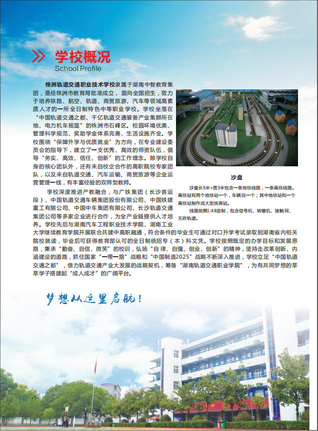 株洲軌道交通職業技術學校招生簡章2020版本 發布時間:2020-06-17 12:02:14 瀏覽量:17659 發布者:株洲軌道交通職業技術學校 株洲軌道學校招生學校代碼:3643000390,服務國家“一帶一路”發展戰略,定位招生、定向培養、定崗就業、入學簽定向培養協議書,專注于培養行業工匠的特色湖南中職學校,集團辦學專家治校,傾力打造品牌職校。以下是株洲軌道交通職業技術學校招生簡章2020版本。