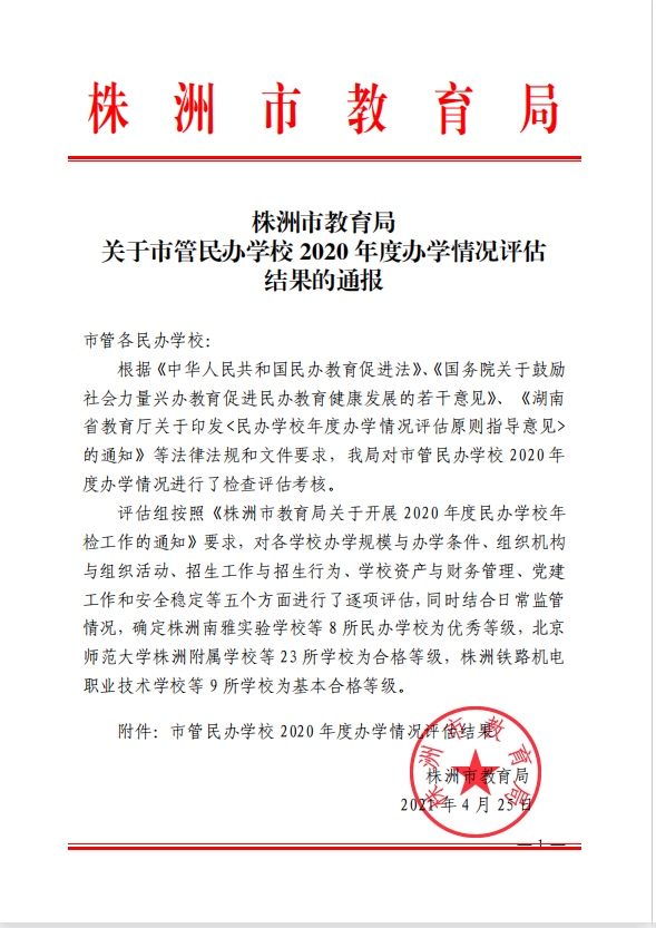 喜報!我校榮獲株洲市2020年年度辦學評估優秀學校 發布時間:2021-05-12 08:53:18 瀏覽量:4341 發布者:株洲軌道交通職業技術學校 喜 報 株洲軌道交通職業技術學校在2020年株洲市辦學情況評估中獲評 優 秀!2021我們將不忘初心,砥礪前行 株洲軌道交通職業技術學校全體教職員工將團結一心,奮勇拼搏,積極創造優良的辦學條件,提高辦學水平,突出辦學特色,專注城市軌道交通,鐵道運輸,幼兒保育、電子商務等專業特色,夯實現代職業教育辦學內涵,辦國家、社會、家長、學生、企業滿意的教育!歡迎2021級初中應屆畢業生報考株洲軌道交通職業技術學校招生代碼:3643000390